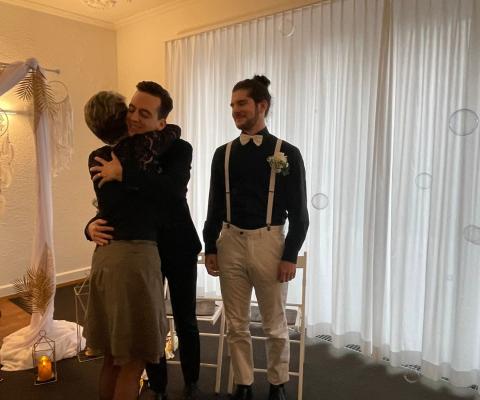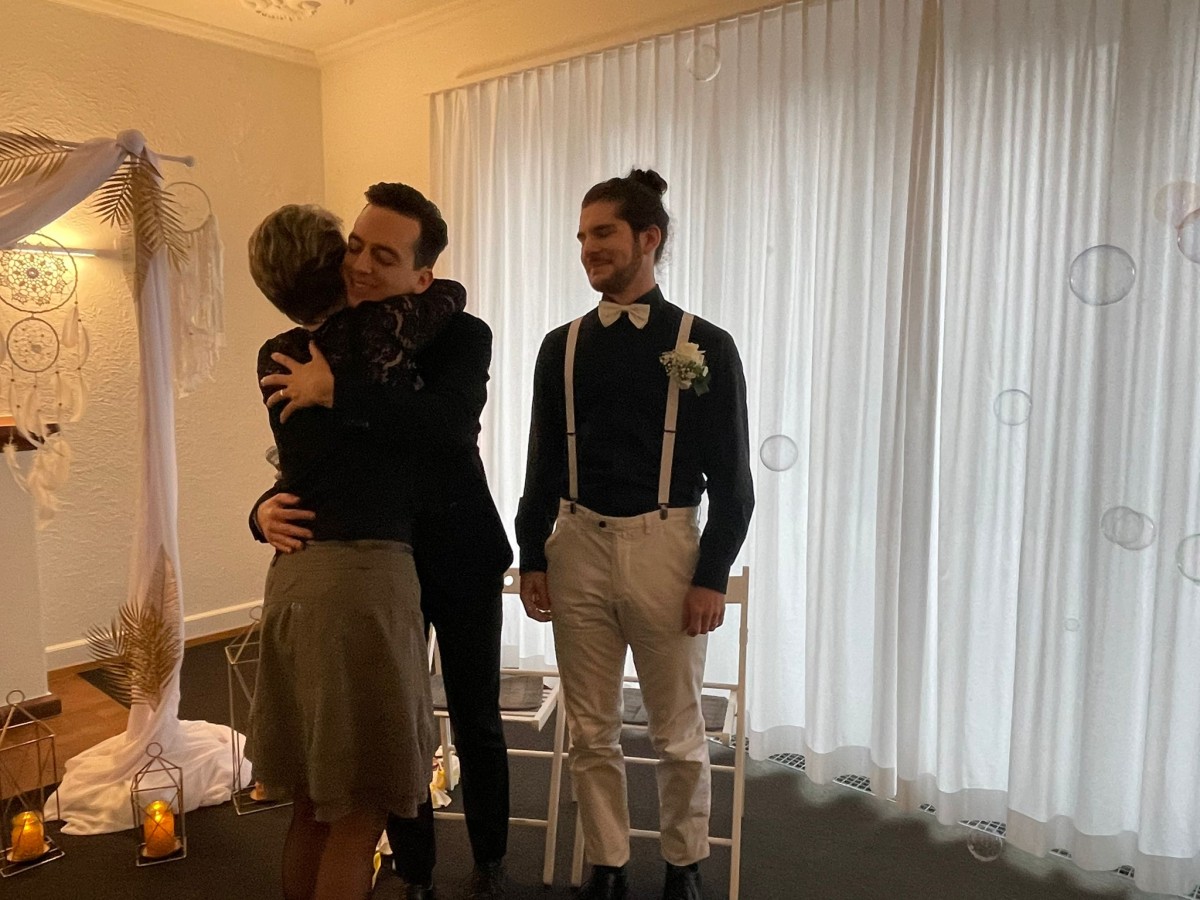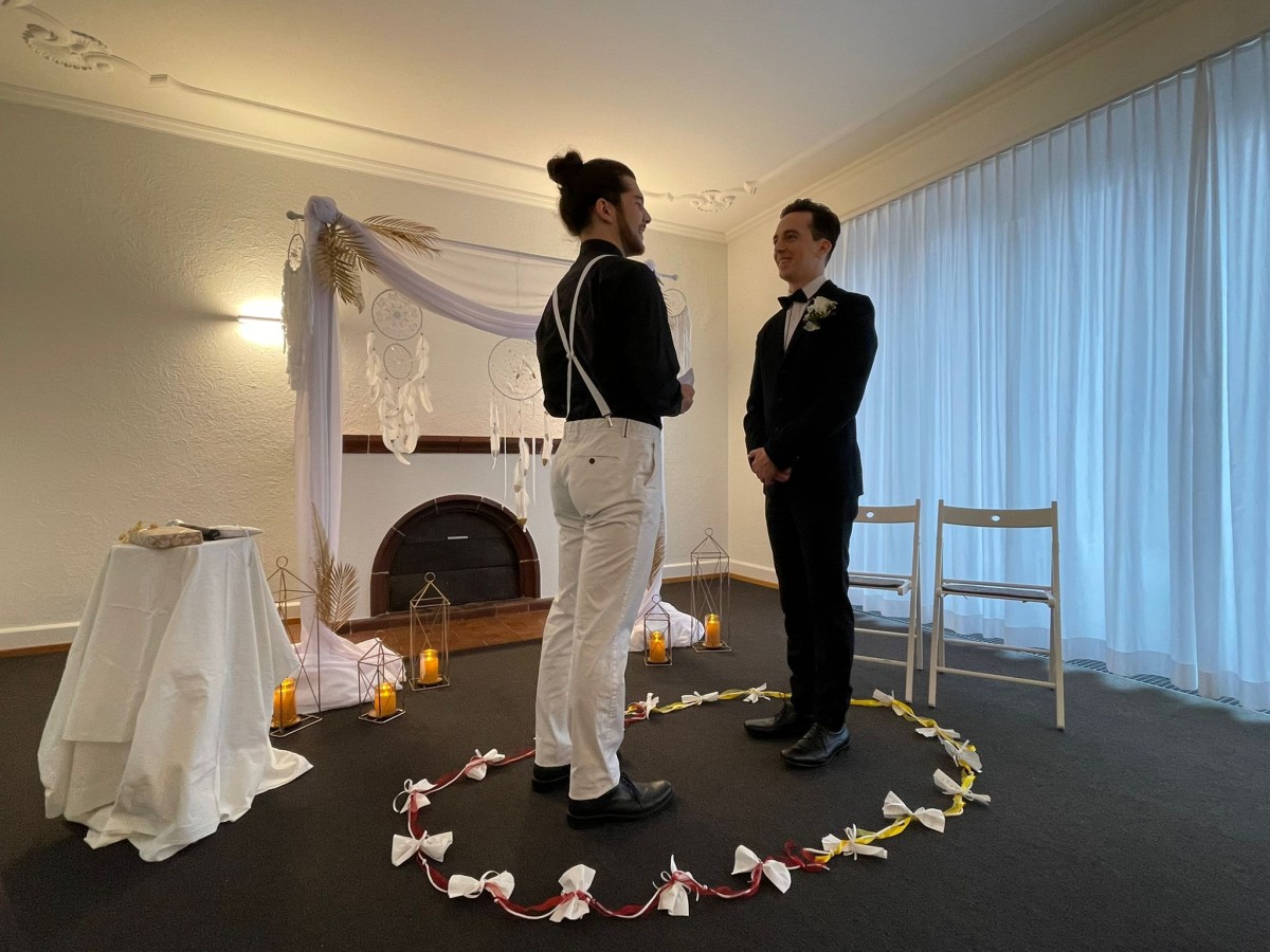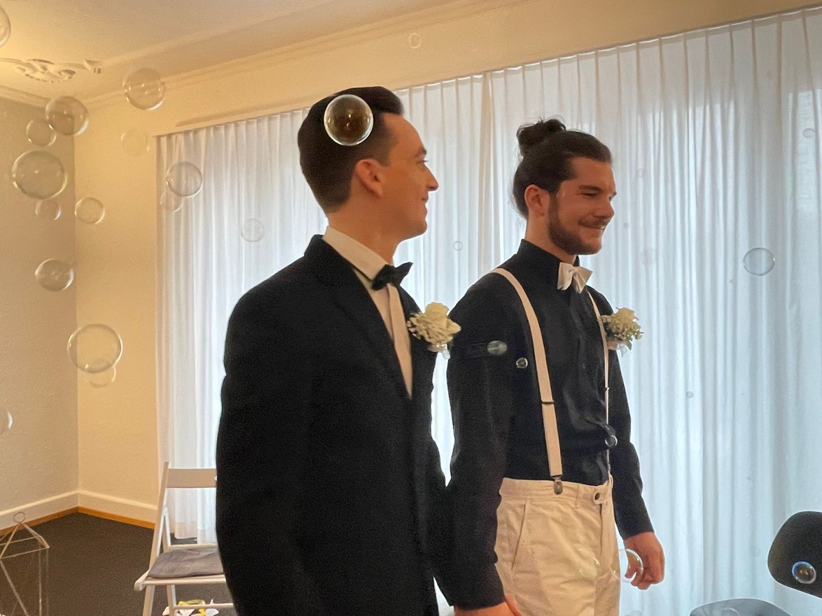 So verliebt, hei sich die zwöi dörfe ihri Liebesgschicht nomau alose, hei sich ihri Liebeserklärig mit viu Gfühl vortreit und ig ha ihne ds JA-Wort entlockt. Drufabe hei si sich ihri Ringe agsteckt und sich töiff i d Auge gluegt. I ha mi mega gfröit mis Trau(m)paar z begleite. Mit vile glänzige Seifeblattere hei mir die zwöi verabschidet.